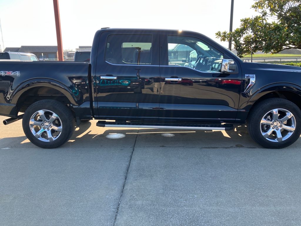 This F-150 Lariat also boasts a stunning Blue exterior, complemented by the chrome-like 20-inch wheels and all-terrain tires, giving it a bold and sophisticated presence on the road. Step inside and you'll be surrounded by premium comfort and convenience features, including heated second-row seats, a power tilt/telescoping steering column with memory, and a wireless charging pad for your devices.