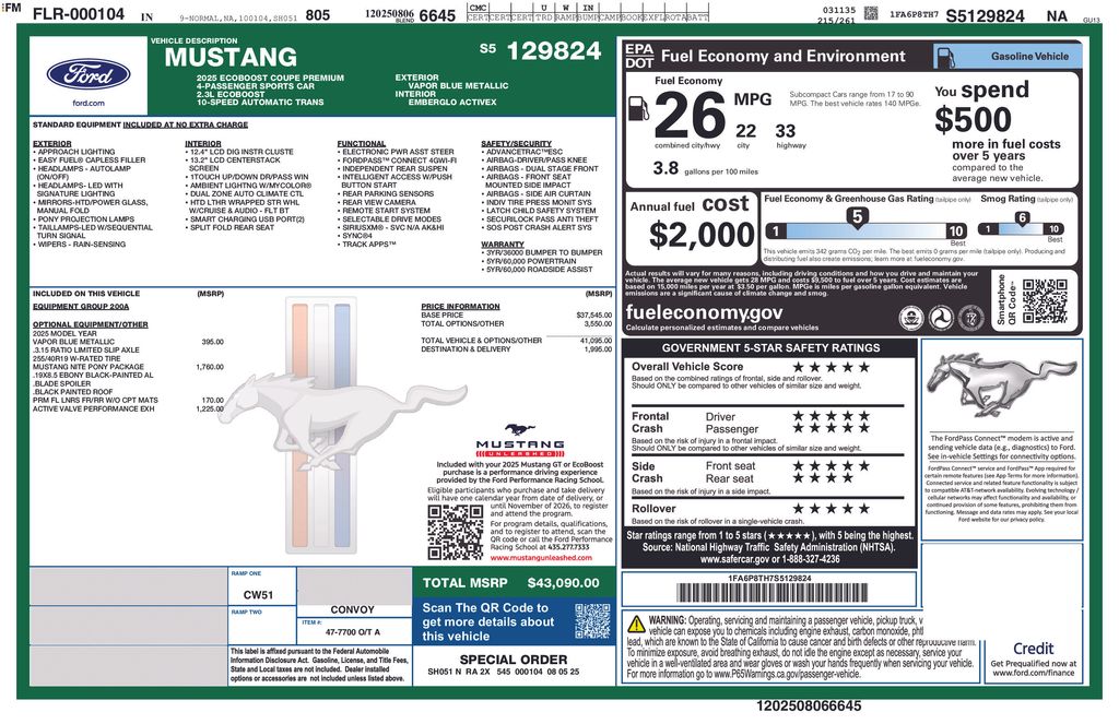 Price includes rebates listed in this description. Price does not include Taxes, Tags, License & Title Fees. Not all customers qualify for all rebates. Must finance through Ford Motor Credit to qualify for all rebates. Not all buyers will qualify for Ford Motor Credit financing. See dealer for Details.$2500 - Retail Customer Cash. Exp. 03/31/2026 2025 Ford Mustang EcoBoost Premium $4,529 off MSRP! 21/32 City/Highway MPG